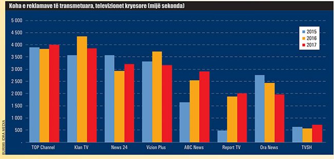E nga këto të dhëna, Top Channel është televizioni që ka transmetuar më shumë kohë publicitare, me 4 milionë sekonda, duke ia kaluar Tv Klan’it, me 3.8 milionë sekonda reklamë.