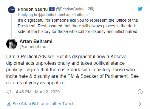 “Unë jam një këshilltar politik. Por është për turp se si një diplomat i Kosovës vepron në mënyrë joprofesionale dhe marrin anë politike publikisht. Unë pajtohem se është një vend i errët në histori: ata që nxisin urrejtje dhe përçarje janë Kryeministri dhe Kryetarja e Parlamentit. Shijoj xhirimet e djeshme si një paragjellë”, ka shkruar tutje Artan Behrami.