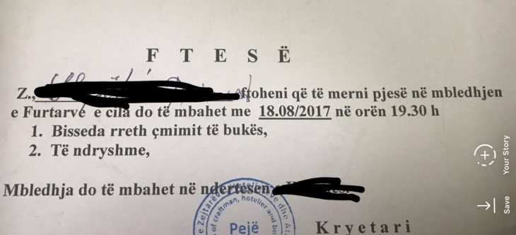 Ftesat për mbledhjen e pronarëve të furrave në Komunën e Pejës