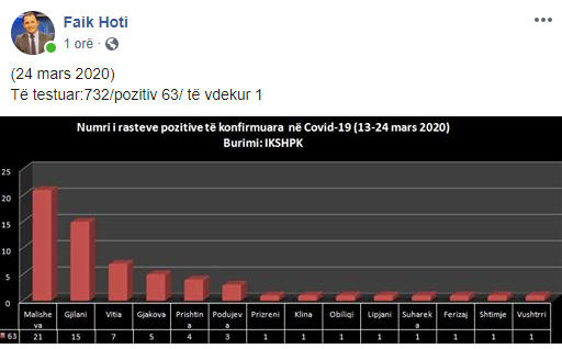 Drejtori i departamentit për informim në Ministrinë e Shëndetësisë, Faik Hoti, ka publikuar një grafikë, e cila tregon numrin e personave të prekur me coronavirus në Kosovë.