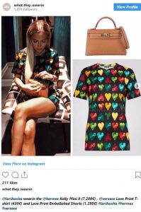 Kostumi me pantallona të shkurtra i saj kushton 1,725 euro dhe janë të markës “Versace”. Praktikisht, bluza kushton 430 euro dhe pantallonat e shkurtra 1 ,295 euro Ndërsa çanta ëshë e markés ‘Hermes’ dhe kushton 7,200 euro. Çantat e kësaj marke janë vertetë shumë të shtrenjta dhe shume të vlefshme. Çantes “Hermes” nuk i ikën asnjëheré vlera pasi ka raste qe mund te shitet dhe me shtrenjtë sesa është blerë.