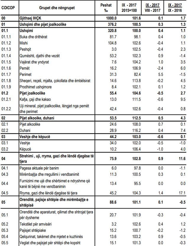 Indeksi i harmonizuar i tërësishëm i çmimeve të konsumit në vend është më i lartë për 0,1% në muajin shtator 2017 krahasuar me muajin gusht 2017. Shkalla e inflacionit e matur në muajin shtator 2017 me muajin shtator 2016 ishte 1,7%. /Insajderi.com