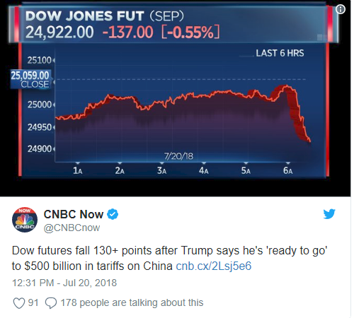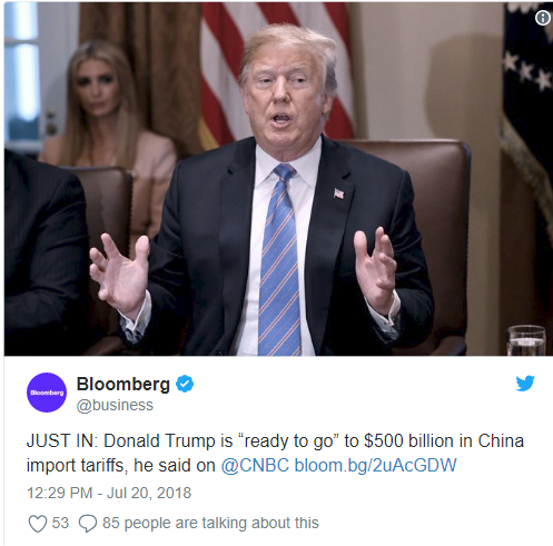 “Jam i gatshëm të shkojmë në 500”, ka pretenduar presidenti i SHBA, duke aluduar në vlerën në dollarë të importit kinez në SHBA në vitin 2017, i cili, siç precizon CNBS, është në vlerë prej 505,5 miliardë dollarë në raport me 129,9 miliardë dollarë të importit amerikan në Kinë.