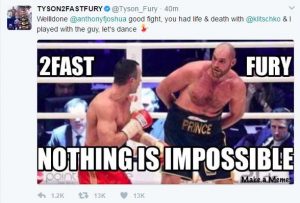 “Të lumtë Anthony Joshua ndeshje e mirë. Ti kishe jetë a vdekje me Klitschkon ndërsa unë luajta lojën ‘le të kërcejmë’ me këtë djalin”, ka shkruar Fury, duke iu referuar me termin “djalë” ukrainasit Klitschko.