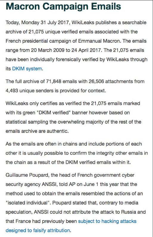 Në total janë 71,848 e-mail-e me 26,506 skedarë dhe 4,493 dërgues unikë. Njoftimi se Macron ishte hakuar u bë publik më 5 Maj, pak ditë përpara se të fitonte përballjen me Marine Le Pen.